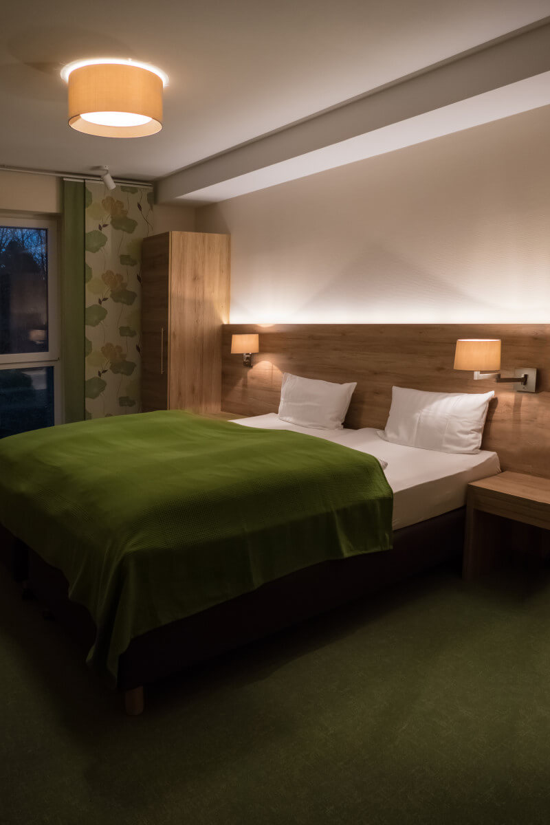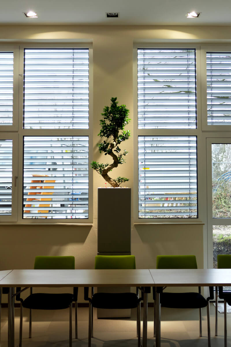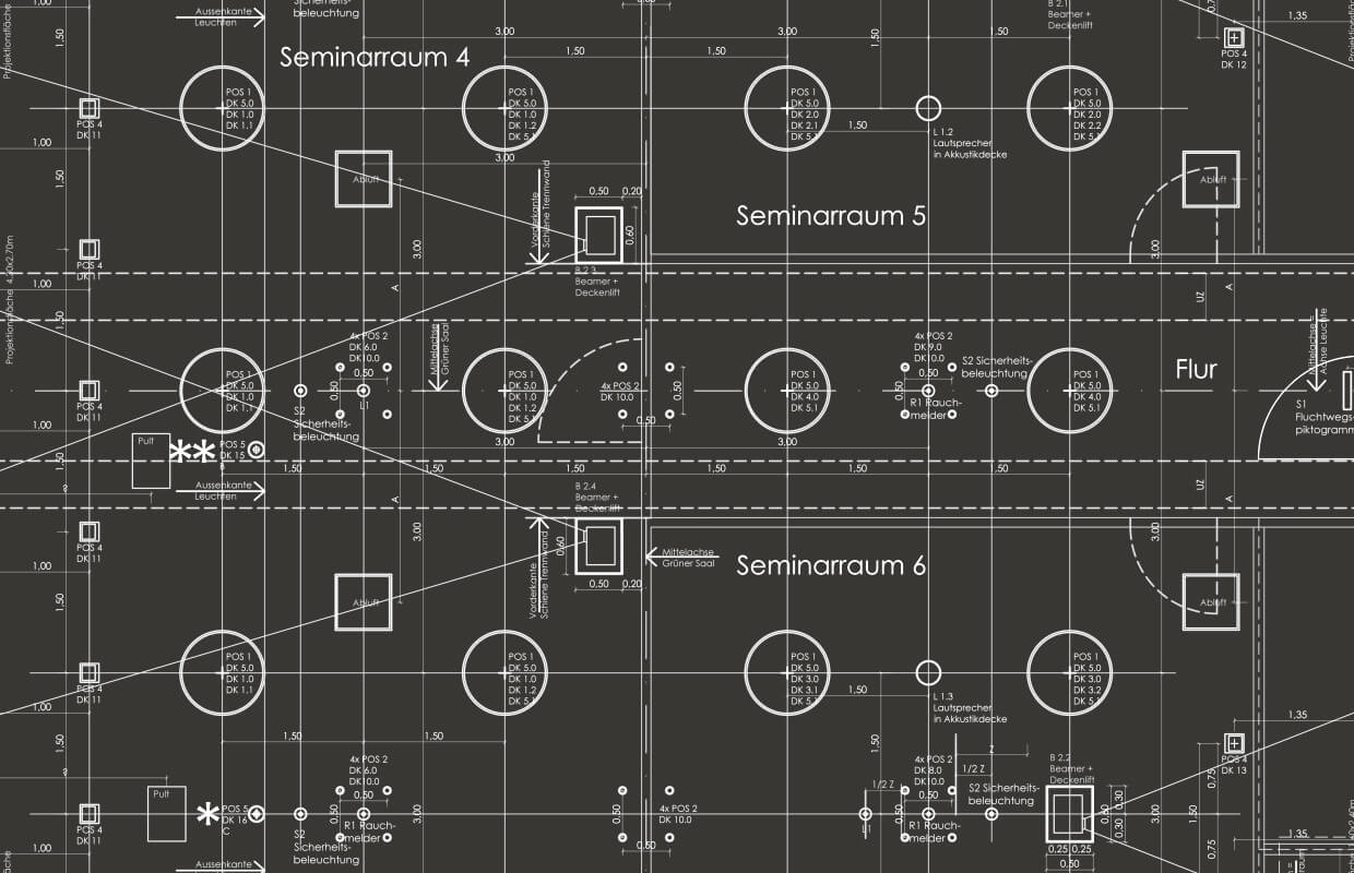 Beim Neubau des Seminargebäudes stand vor allem eine multifunktionelle Nutzung im Vordergrund der Lichtplanung. Die Beleuchtung des "Grünen Saals" ermöglicht einen Seminarbetrieb für verschiedenste Angebote in großen und kleinen Gruppen. Unterschiedliche Lichtszenen, wie z.B. Vortrag, Beamerpräsentation, Konferenz, Veranstaltung, Pflanzlicht, können abgerufen werden. Je nach Wahl werden die verschiedenen Leuchtentypen aufgerufen und geben dem Saal die gewünschte Helligkeit und Atmosphäre. In Bezug auf die Fensteraufteilung erzeugen flächige, runde Leuchten mit großem Durchmesser das Grundlicht. Der bewusst leicht gekippte Einbau lockert die strenge Anordnung auf. Ergänzende, deckenbündige Downlights in 4er Anordnung, die Anstrahlung der Rückwand durch Wallwasher, sowie die Akzentuierung der großen Pflanztöpfe erleuchten den Saal in vielfältigen Lichtlandschaften.