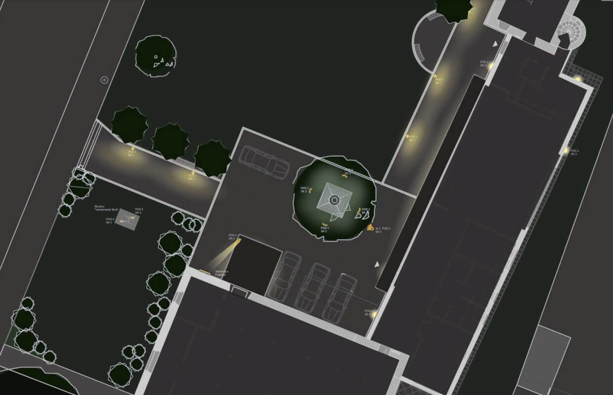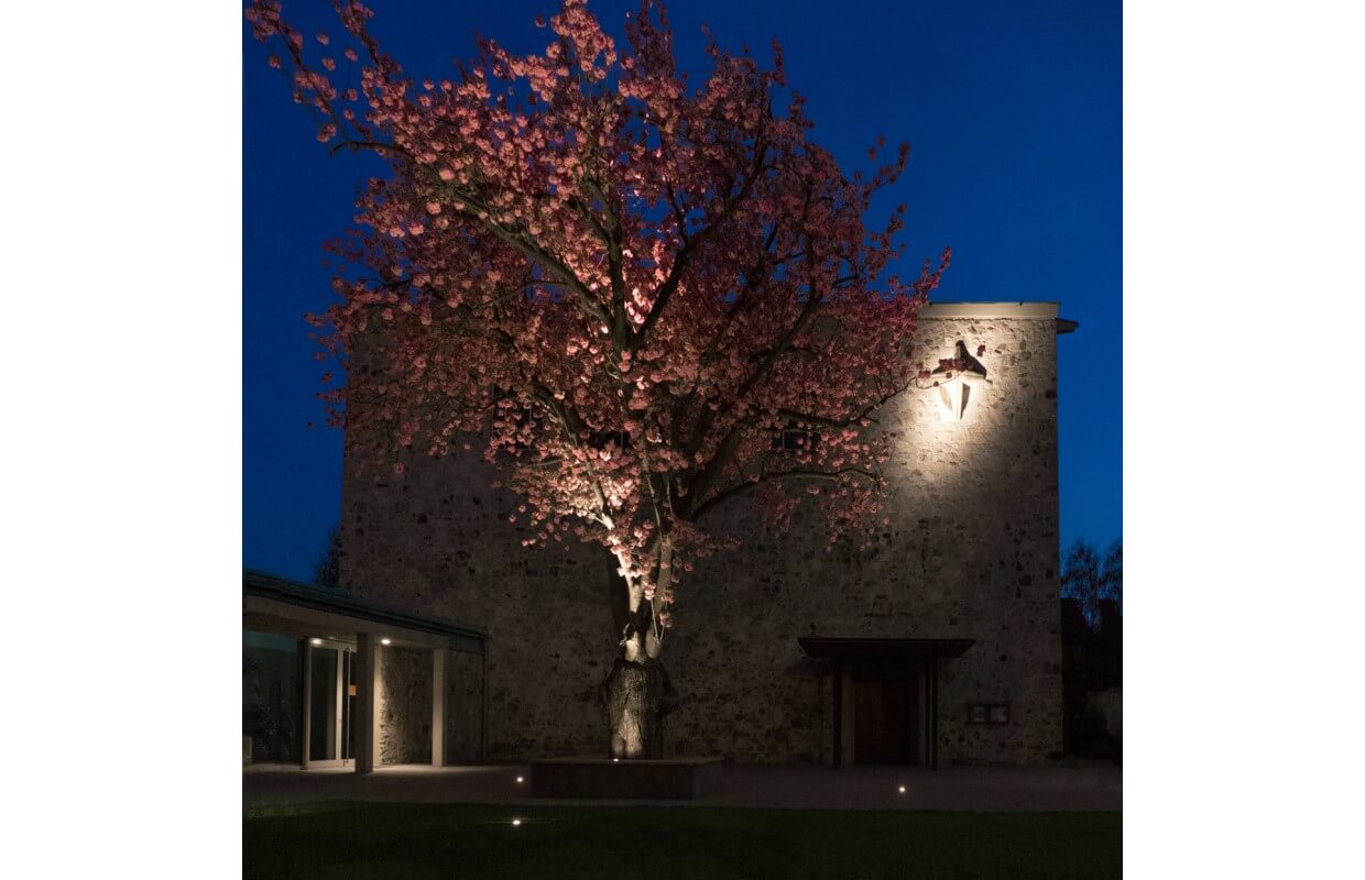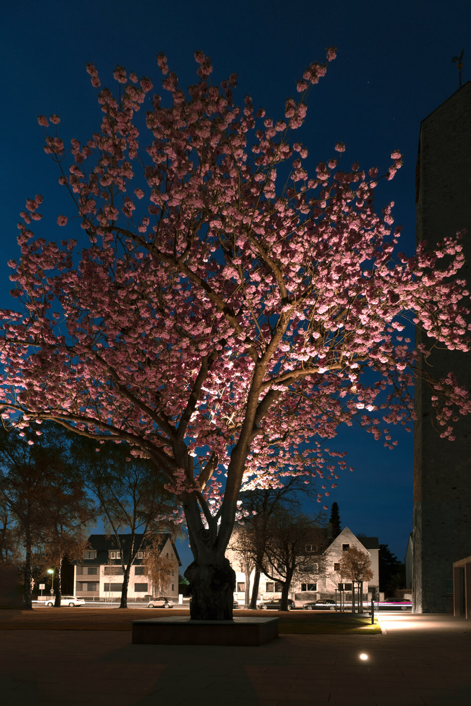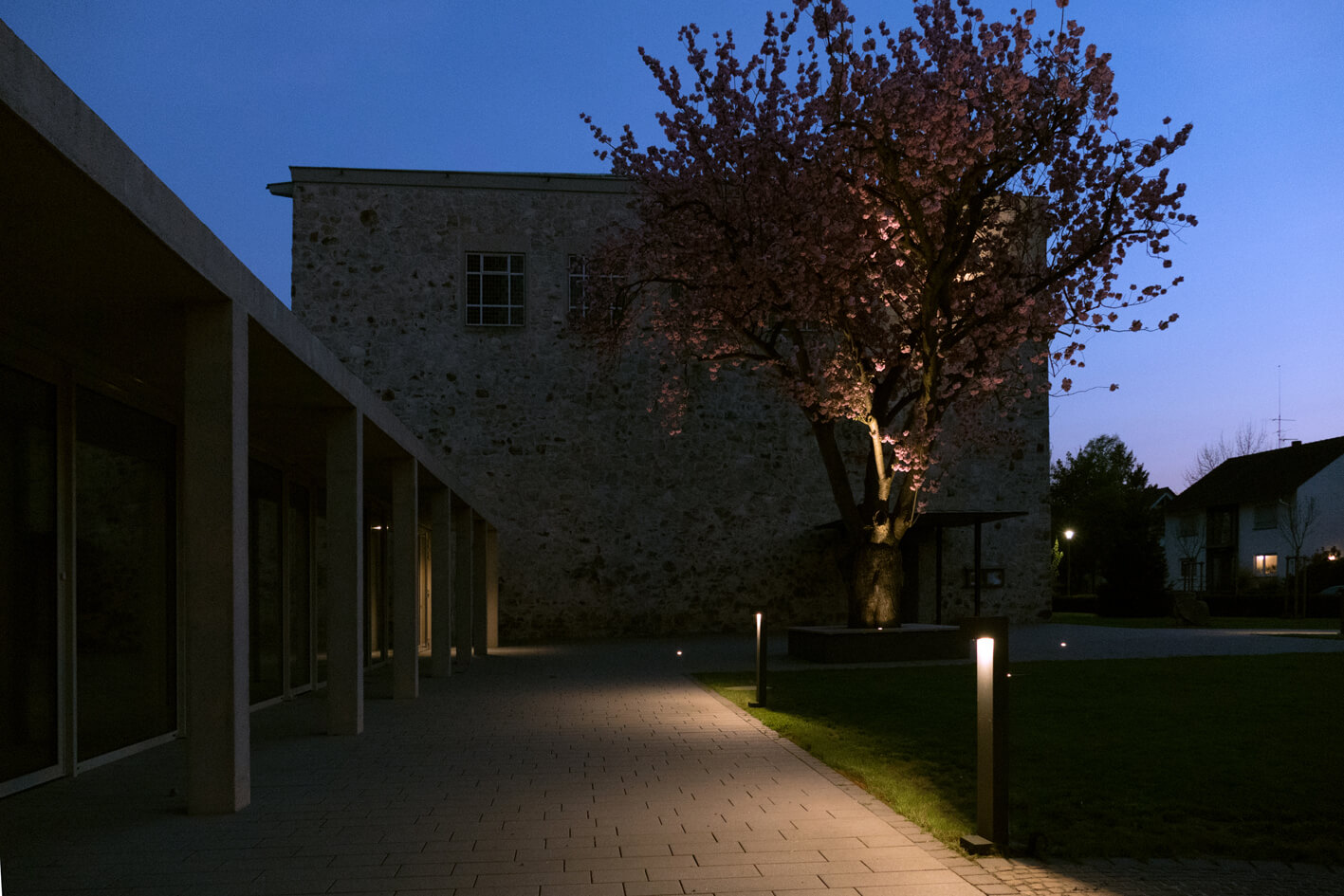 Unmittelbar an der Frankfurter Landstraße gelegen, wird im Vorbeifahren oder -gehen ein einladender Raum sichtbar. Abgeblendete Pollerleuchten mit bandförmiger Lichtoptik begleiten die zwei Wege zur Kirche und dem Gemeindezentrum. Im Zentrum des Platzes wird der Kirschbaum von kleinen Bodeneinbaustrahlern dezent unterleuchtet. Ein engstrahlender Richtstrahler akzentuiert das in die Sandsteinfassade integrierte Kreuz und lässt es plastisch aus der Wand hervortreten.