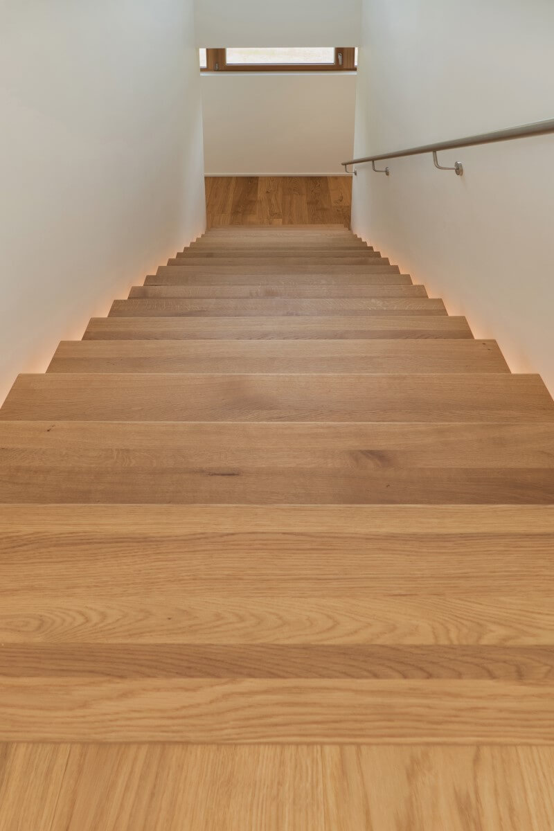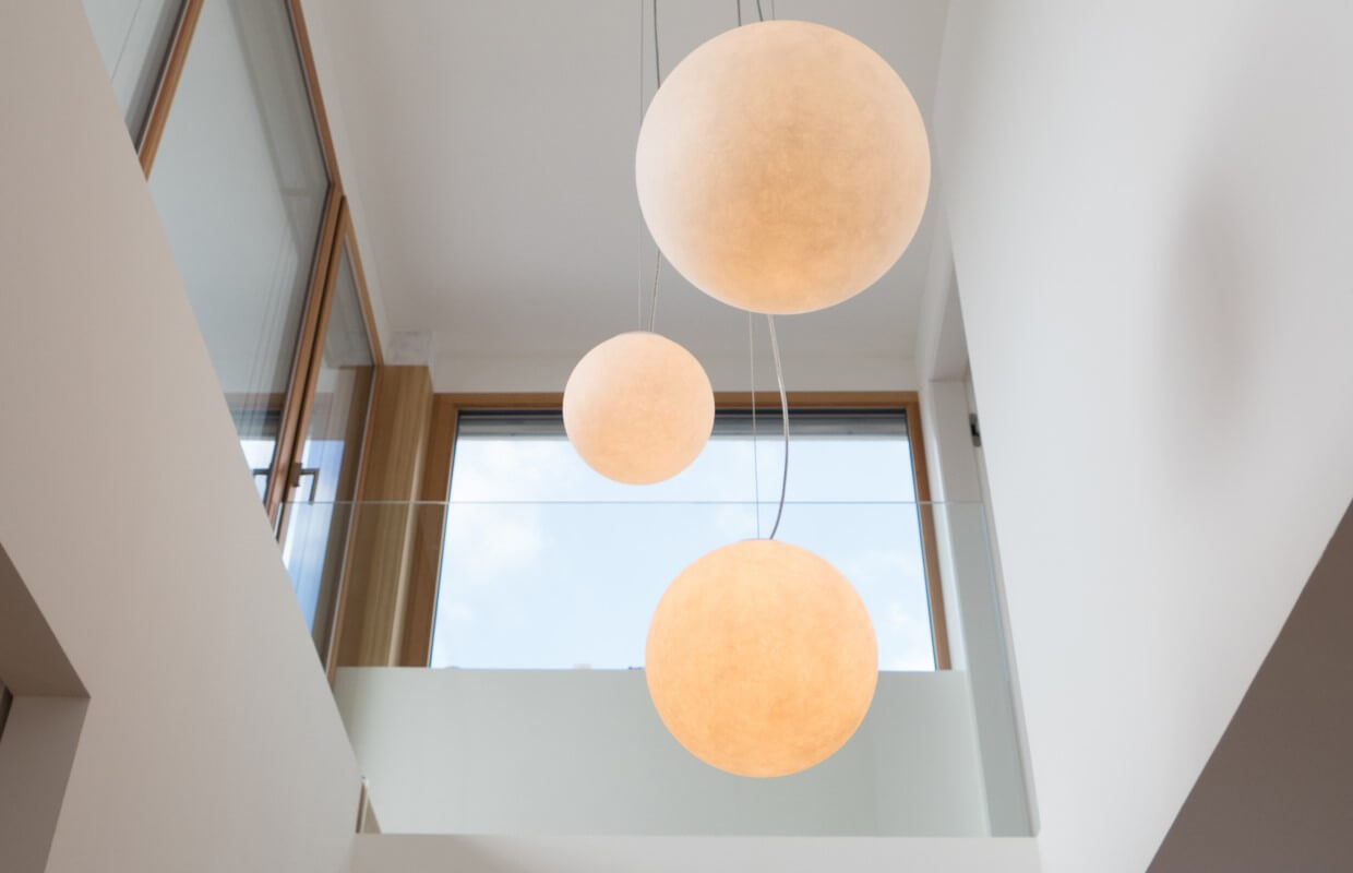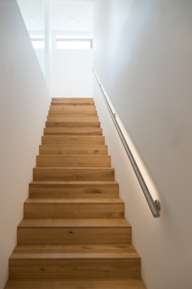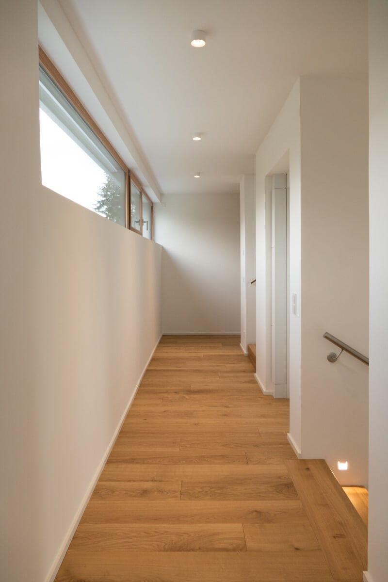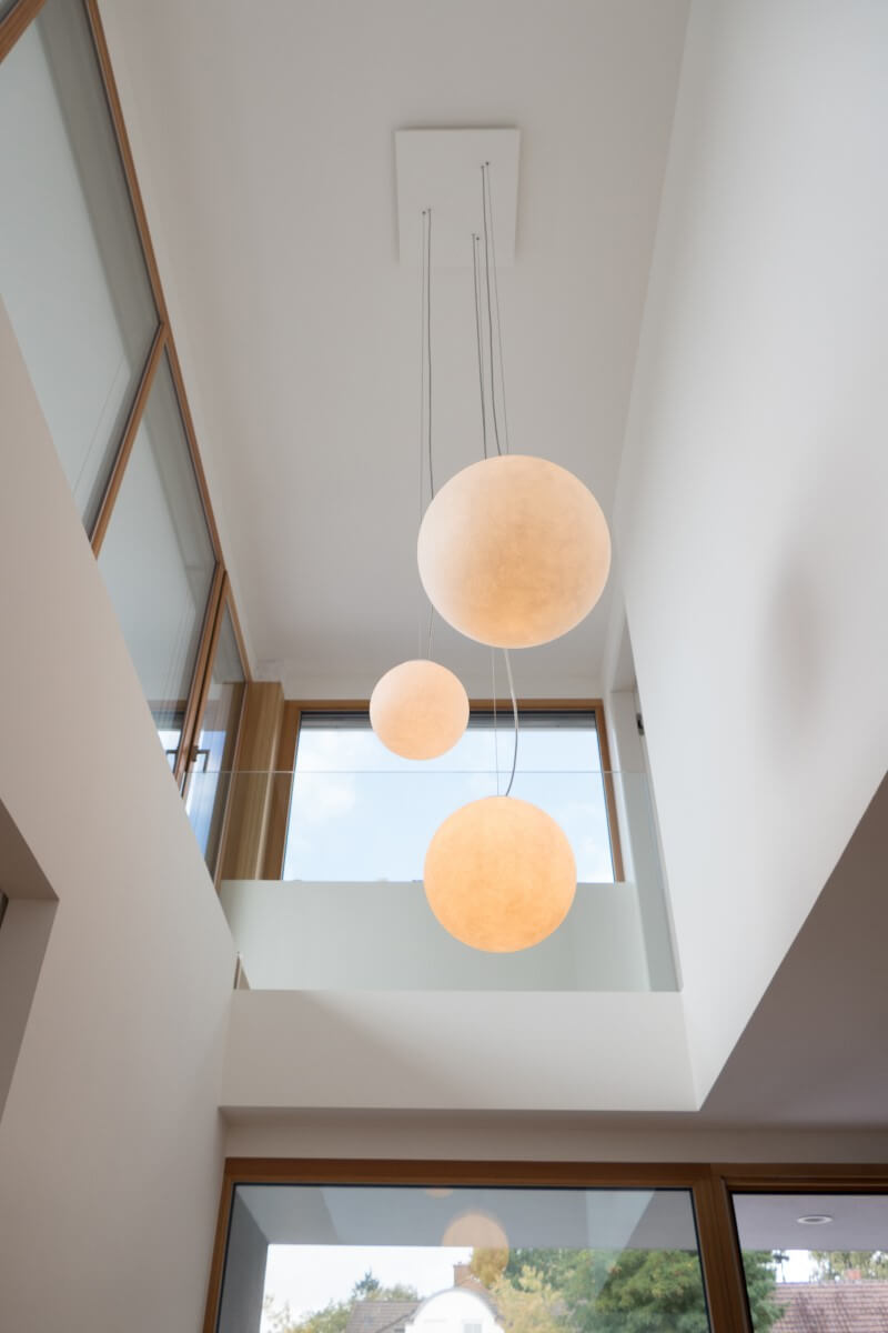 Natürliche Farben, wertige Materialien und Oberflächen, ein klarer Grundriss und große Fensterflächen zeichnen den Architektenentwurf aus. Das Licht integriert sich unauffällig und dimmbar in die betonkernaktivierten Decken. Indirektes Licht in Fugen und hinterleuchtete Flächen in den Bädern sorgen für ein sanftes Hintergrundlicht. Gerichtetes Licht in Handläufen und Treppenwänden lenken das Licht blendfrei auf den Bereich, der zu beleuchten ist. Im Eingangsbereich wird der Blick in die Höhe gelenkt: drei Pendelleuchten in unterschiedlichen Größen und Höhen schweben im Raum und machen die besondere Raumhöhe erfahrbar.