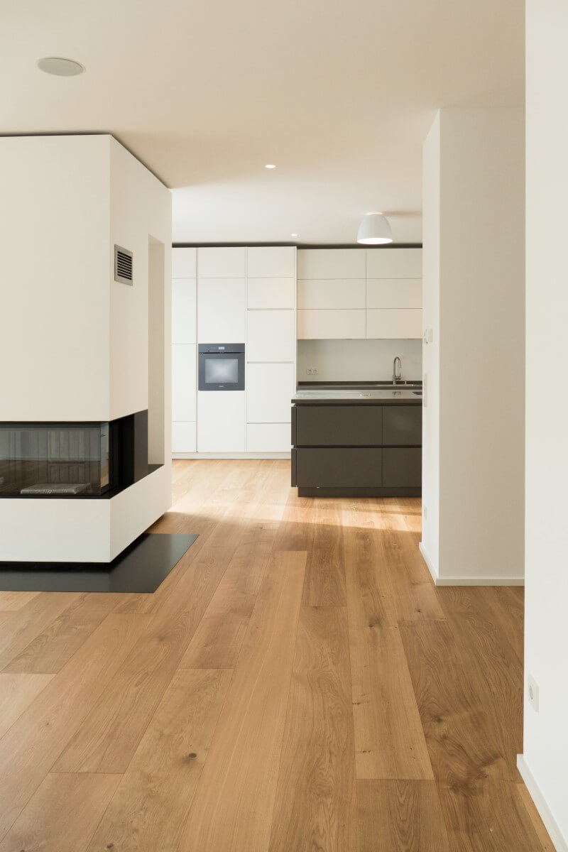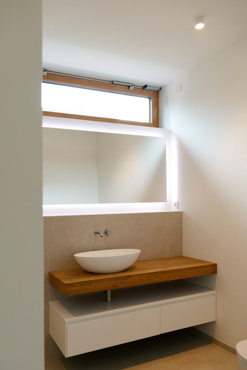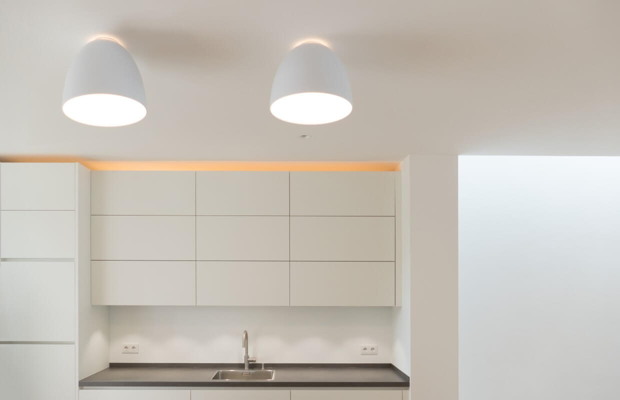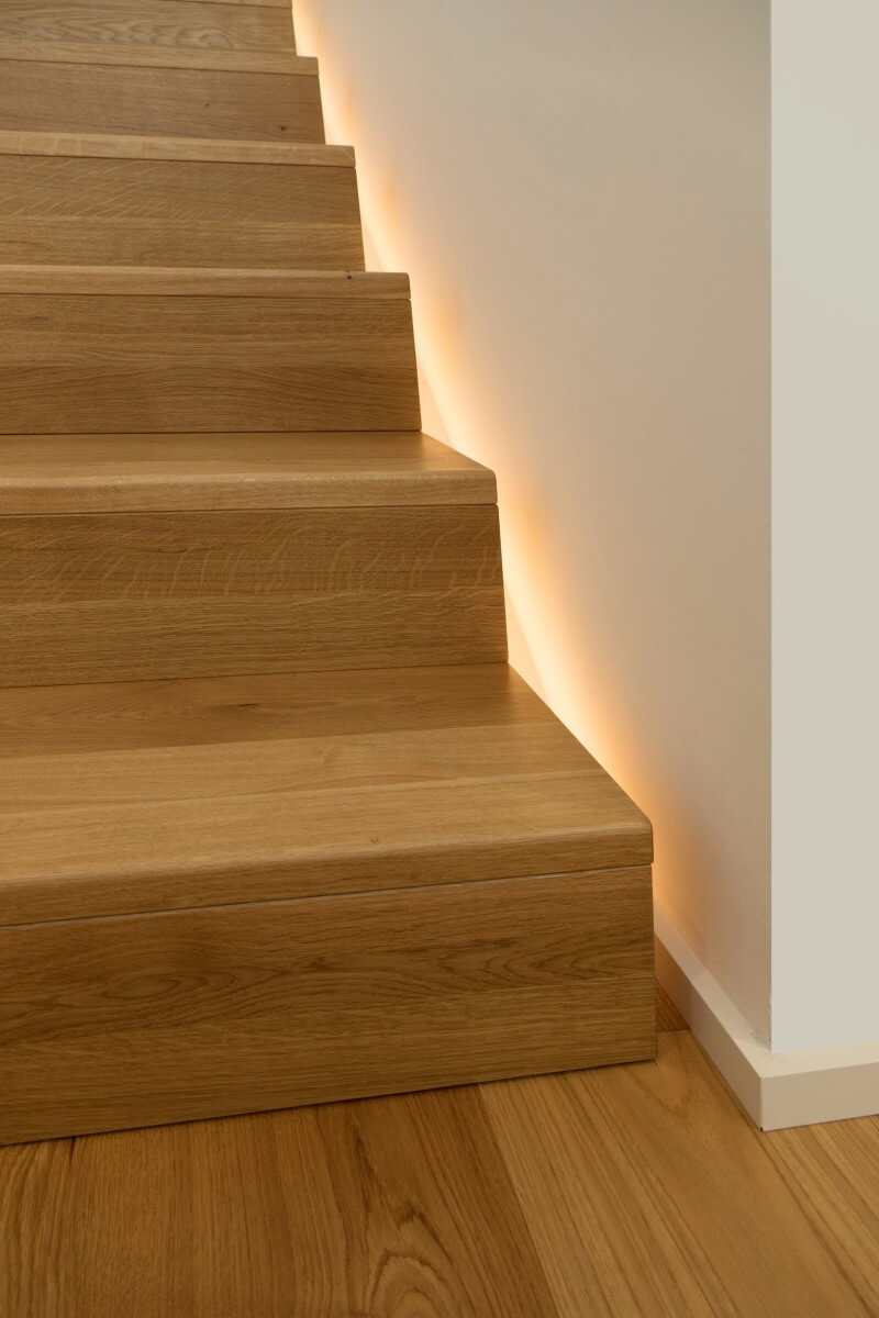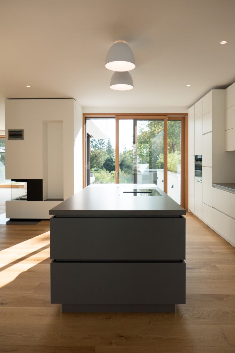 Natürliche Farben, wertige Materialien und Oberflächen, ein klarer Grundriss und große Fensterflächen zeichnen den Architektenentwurf aus. Das Licht integriert sich unauffällig und dimmbar in die betonkernaktivierten Decken. Indirektes Licht in Fugen und hinterleuchtete Flächen in den Bädern sorgen für ein sanftes Hintergrundlicht. Gerichtetes Licht in Handläufen und Treppenwänden lenken das Licht blendfrei auf den Bereich, der zu beleuchten ist. Im Eingangsbereich wird der Blick in die Höhe gelenkt: drei Pendelleuchten in unterschiedlichen Größen und Höhen schweben im Raum und machen die besondere Raumhöhe erfahrbar.
