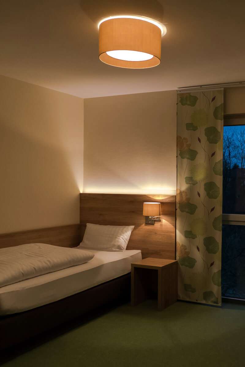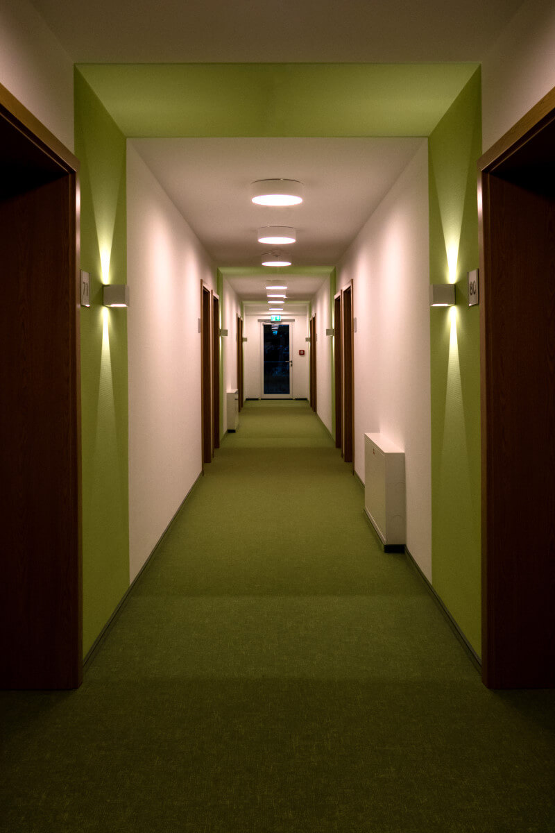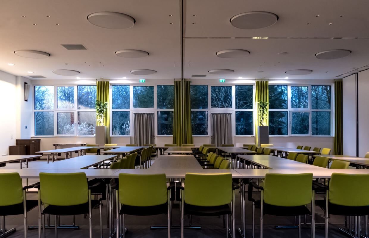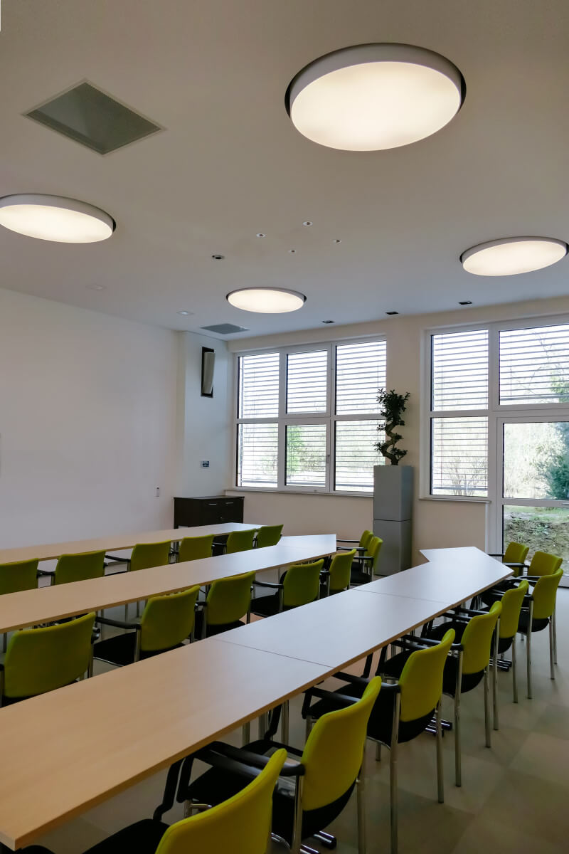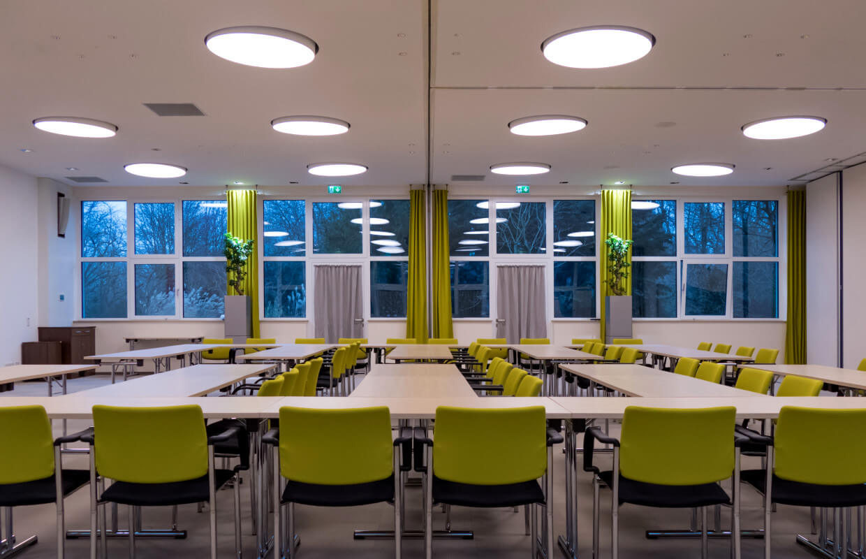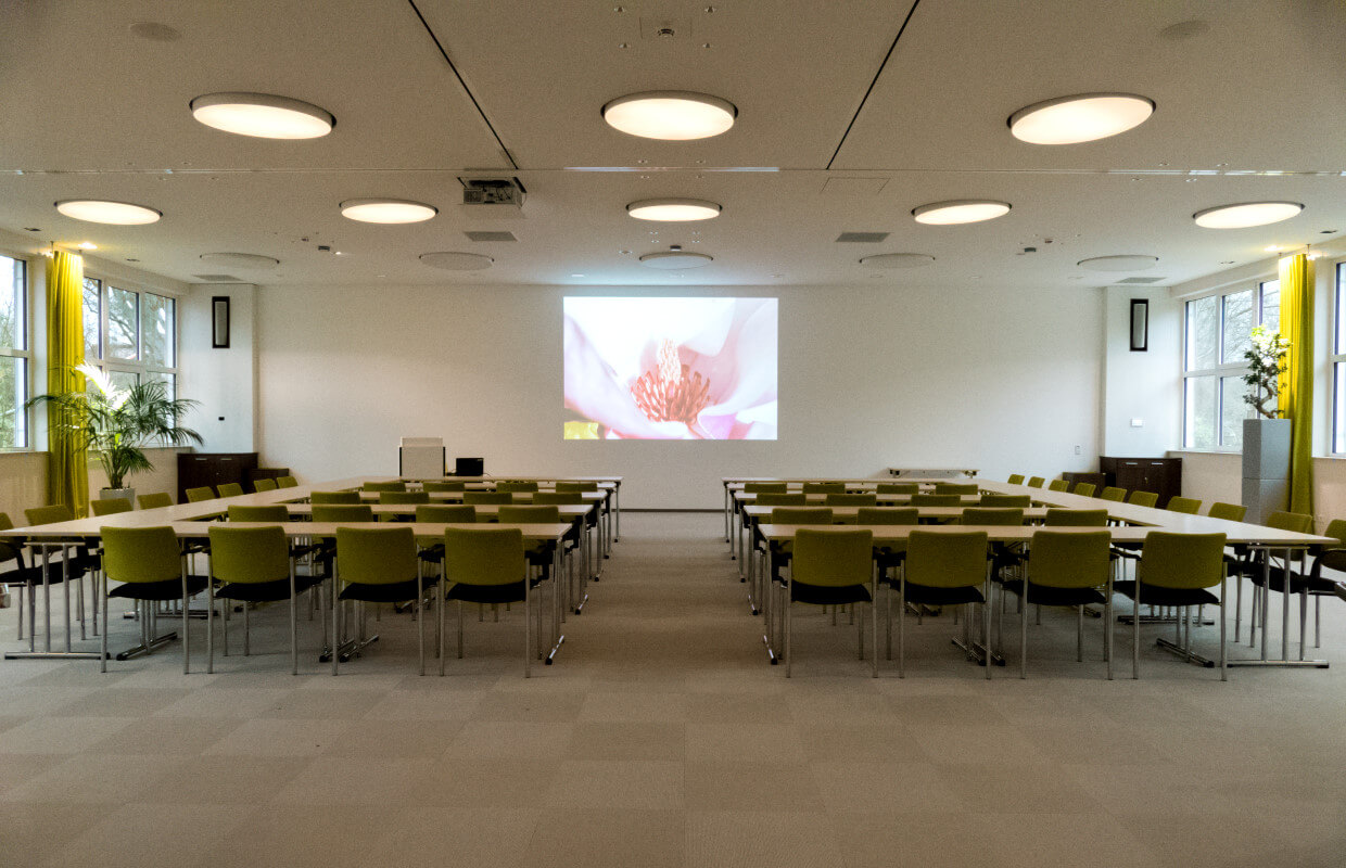 Beim Neubau des Seminargebäudes stand vor allem eine multifunktionelle Nutzung im Vordergrund der Lichtplanung. Die Beleuchtung des "Grünen Saals" ermöglicht einen Seminarbetrieb für verschiedenste Angebote in großen und kleinen Gruppen. Unterschiedliche Lichtszenen, wie z.B. Vortrag, Beamerpräsentation, Konferenz, Veranstaltung, Pflanzlicht, können abgerufen werden. Je nach Wahl werden die verschiedenen Leuchtentypen aufgerufen und geben dem Saal die gewünschte Helligkeit und Atmosphäre. In Bezug auf die Fensteraufteilung erzeugen flächige, runde Leuchten mit großem Durchmesser das Grundlicht. Der bewusst leicht gekippte Einbau lockert die strenge Anordnung auf. Ergänzende, deckenbündige Downlights in 4er Anordnung, die Anstrahlung der Rückwand durch Wallwasher, sowie die Akzentuierung der großen Pflanztöpfe erleuchten den Saal in vielfältigen Lichtlandschaften.