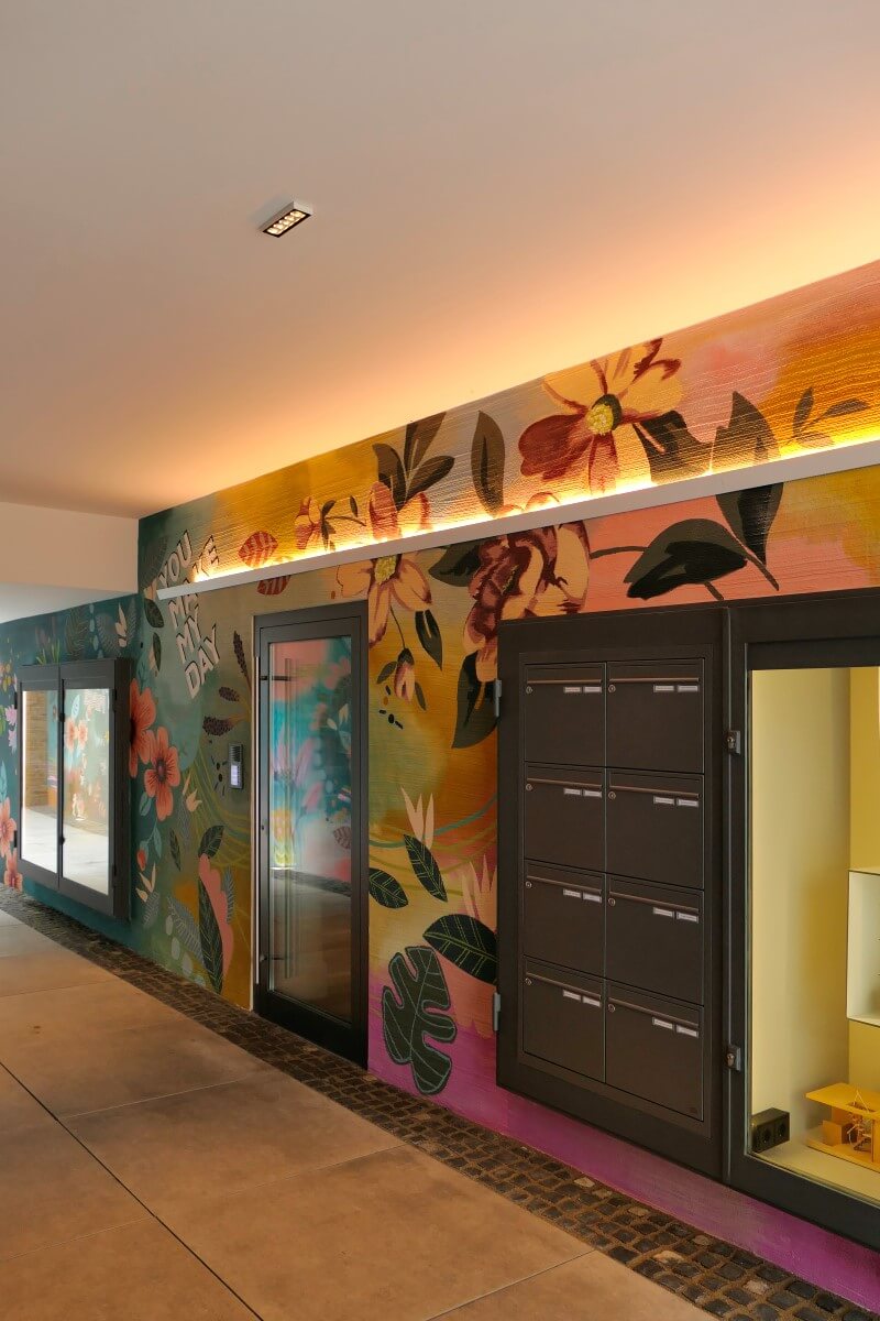 Neben kleinen Ladengeschäften in der Fussgängerzone Hanaus, öffnet sich ein kleiner Durchgang zu einem Hinterhof. Minimale, lineare Einbaudownlights in der Decke geben ein gleichmäßiges, warmweißes Grundlicht auf den Boden und laden Fussgänger ein, den Schritt in die Passage zu wagen. Künstlerisch bemalte Wände erhalten durch die indirekte Unterleuchtung mittels einer rgb Lichtlinie einen zusätzlichen Farbkick. Dezent beleuchtete Schaukästen ziehen ebenfalls die Blicke auf sich und machen auf das neugierig, was die Passanten im Hinterhof erwartet.