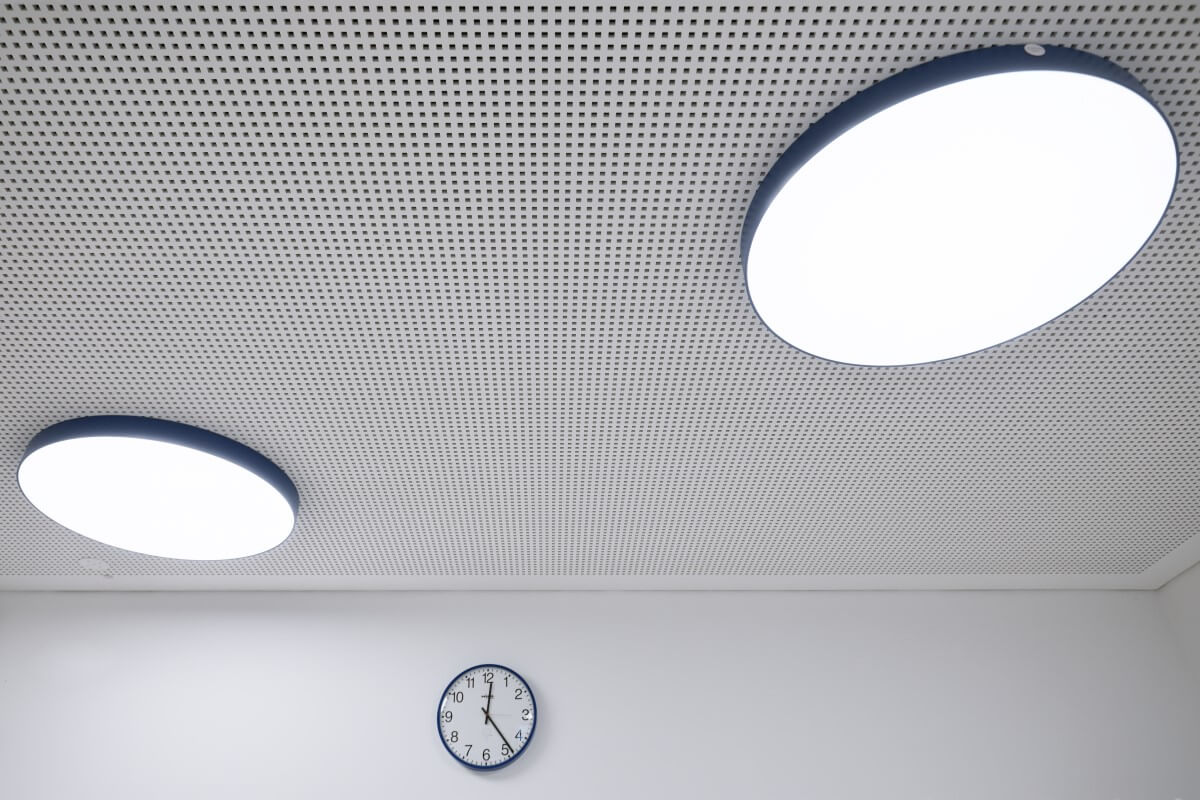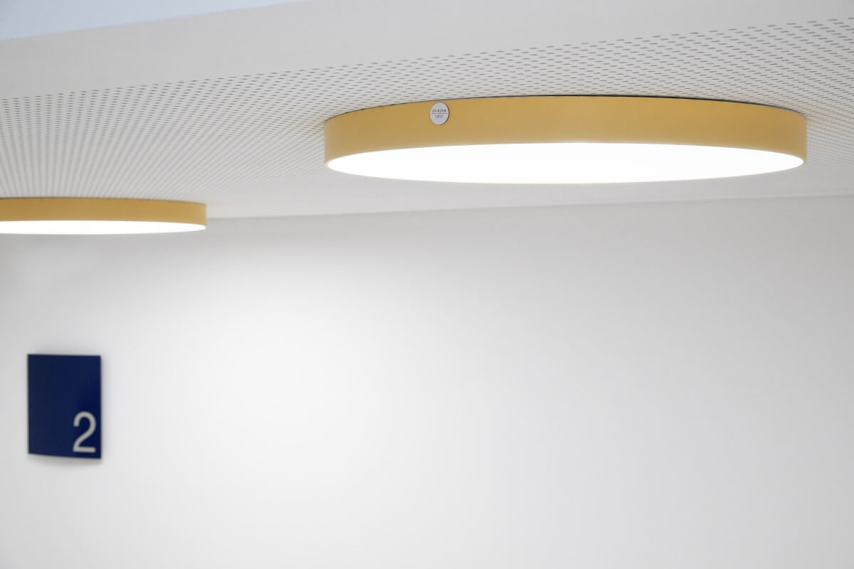 Gewählt wurde eine Beleuchtung aus großen runden Flächenleuchten, die als Anbauvariante unterhalb der Akustikdecke montiert ist. Zur Unterscheidung der jeweiligen Geschosse, erhalten die Leuchten auf den Verteilerflächen jeweils eine eigene Montessori konforme Farbe: rot-blau-grün-gelb.