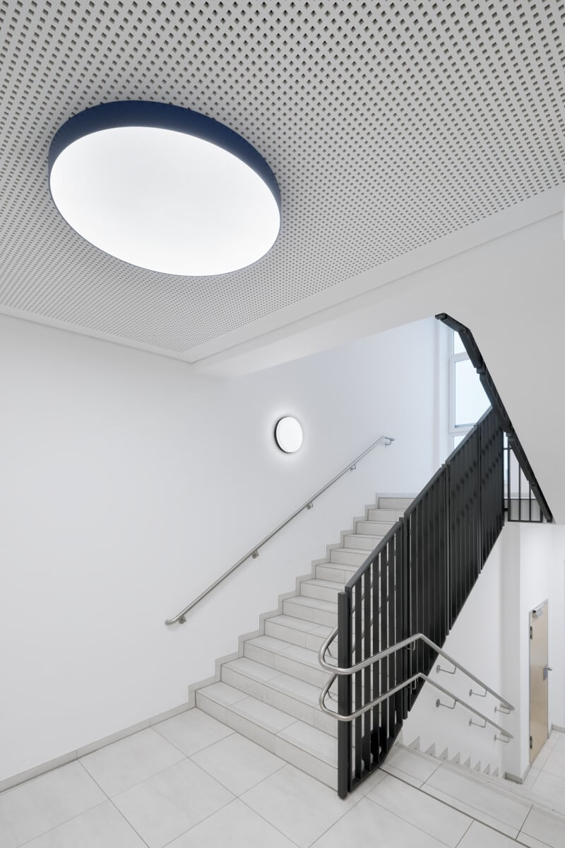 Im Treppenraum selbst wird eine kleinere Variante der gleichen Leuchtenfamilie in neutralem graphitgrau gewählt. Hier kommen neben der Deckenleuchte auch Wandleuchten zum Einsatz. Sie nehmen das Motiv des runden Fensters in der Innenwand der Hochparterre auf und begleiten die Schüler*innen, Lehrer*innen und Besucher*innen auf ihrem Weg. Der überwiegende Teil der DIN konformen Sicherheitsbeleuchtung ist in den Leuchten integriert, sodass sich das Deckenbild ruhig und aufgeräumt darstellt.