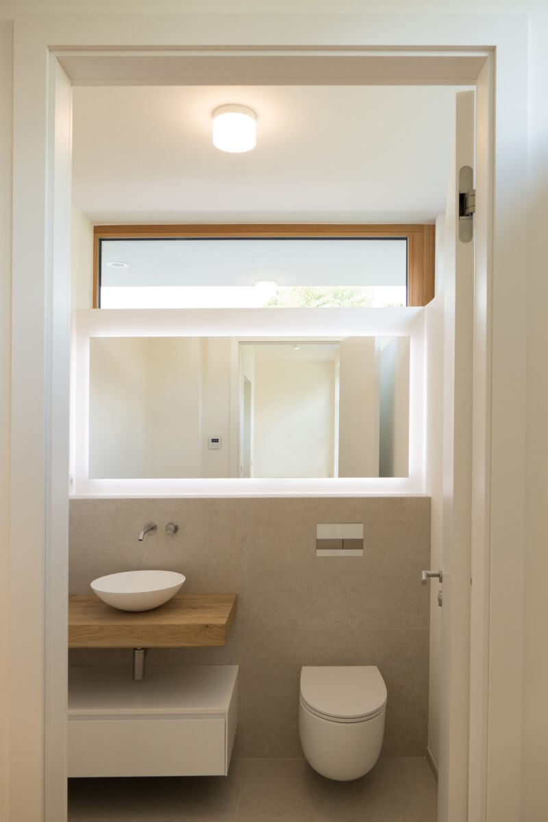 Natürliche Farben, wertige Materialien und Oberflächen, ein klarer Grundriss und große Fensterflächen zeichnen den Architektenentwurf aus. Das Licht integriert sich unauffällig und dimmbar in die betonkernaktivierten Decken. Indirektes Licht in Fugen und hinterleuchtete Flächen in den Bädern sorgen für ein sanftes Hintergrundlicht. Gerichtetes Licht in Handläufen und Treppenwänden lenken das Licht blendfrei auf den Bereich, der zu beleuchten ist. Im Eingangsbereich wird der Blick in die Höhe gelenkt: drei Pendelleuchten in unterschiedlichen Größen und Höhen schweben im Raum und machen die besondere Raumhöhe erfahrbar.